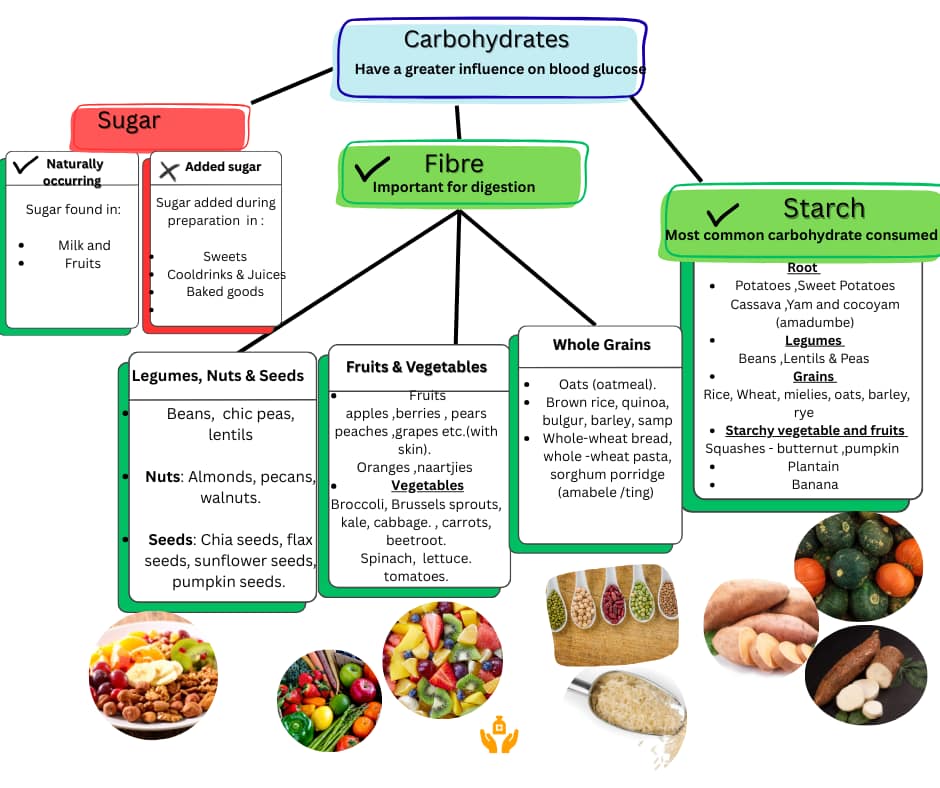 Starch is the most common type of carbohydrate consumed. It is mostly found in staple foods like rice, potatoes and mealie meal.