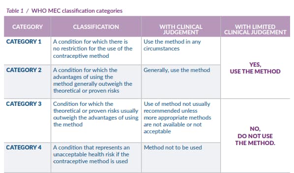 Choosing a suitable family planning method for women living with diabetes requires a careful balance of the risk vs benefits of the method in relation to the condition. World Health Organization medical eligibility criteria (WHO MEC) for contraceptives, provides guidance for the safe use of contraceptives for those living with chronic medical conditions. The guide classifies the different contraceptive methods into four categories based on safety in relation to the medical condition at hand.